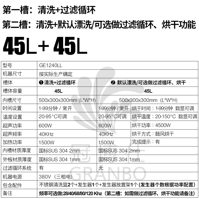 冠博仕GE1240LL|雙槽超聲波清洗機(jī)|45L/600W 支持定制